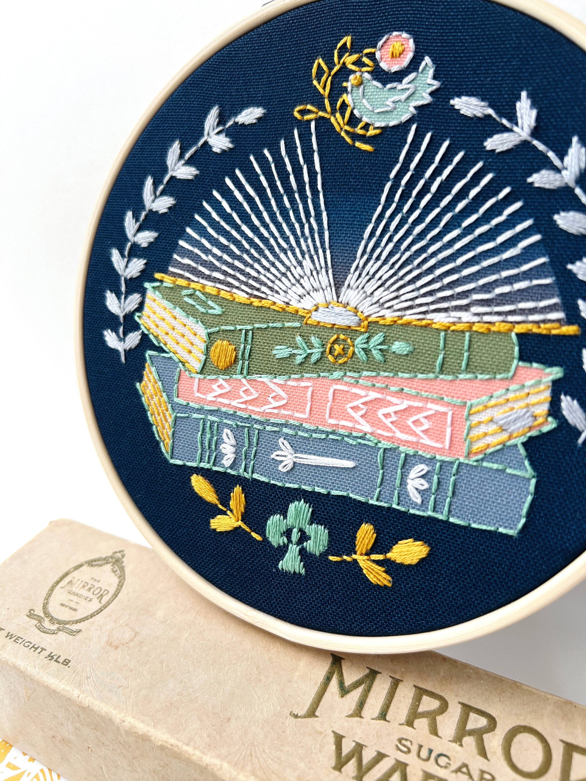 Celebrate your love of reading with this lovely stack of decorated books! This book lovers embroidery kit would look so nice propped up on your bookshelf next to your favorite novel. Kit has everything you need to complete this 6 inch hoop and is great for beginners.